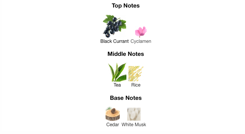 Blackcurrant absolute, Genmaicha Tea extract, Cedarwood essenceTop: Blackcurrant buds absolute Bourgogne, Puffed rice accord